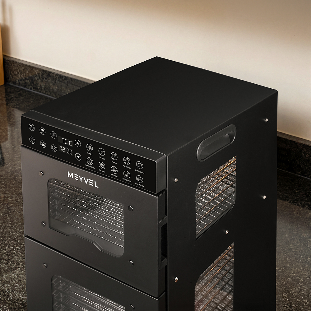 Meyvel MDH20-1S2 (Чёрный) (Black) — это современный дегидратор, который создан для тех, кто хочет заготавливать фрукты, овощи, мясо, травы и ягоды без потери их вкуса и пользы круглый год. Прочный корпус, продуманная конструкция и умная электроника превращают его в надёжного помощника на каждый сезон.